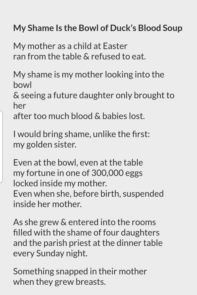 Shame has trailed me throughout my life and can really weigh me down. Once, someone asked me where I got my shame from. The easy answer is 13 years of Catholic school, but I know it’s more complicated than that. This poem is an imperfect meditation on that question. During the writing process, I paired this question with the images I got in my head when my mother told me about having to eat duck’s blood soup at Easter. That’s one Polish tradition that she didn’t perpetuate with us! This memory of hers, combined with other family stories and secrets created this poem.