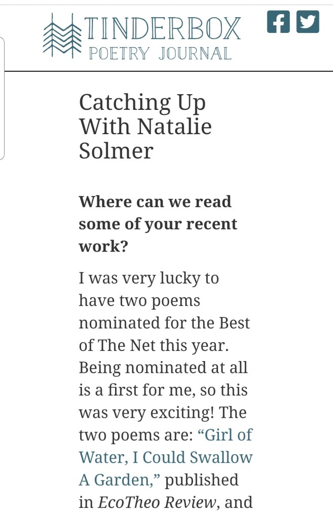 I’ll admit I was surprised and incredibly pleased when Sarah Ann Winn from Tinderbox Poetry Journal contacted me to do a catch up interview about what I’ve been writing and reading! Tinderbox was one of the very first places to ever publish me, and I am eternally grateful! Click on the link to read my responses.