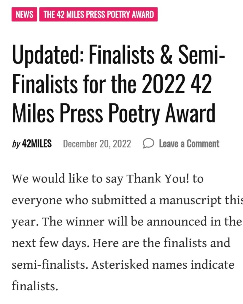 My manuscript was one of 15 finalists (out of over 430 manuscripts)for the 42 Miles Press Poetry Award, out of Indiana University South Bend ❤️ I’m getting closer to publishing my first book…finally. And I was thrilled to see that I am in the company of some incredible poets!