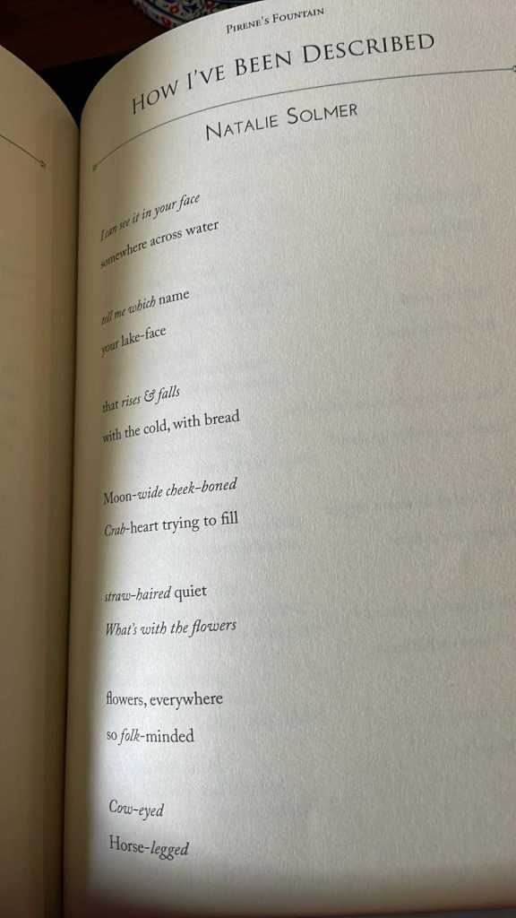 “One Hundred Years, May You Live” and “How I’ve Been Described” Posted by nataliesolmer on September 24, 2025 Thanks to Pirene’s Fountain with Glass Lyre Press for including two of my poems in their latest issue Share this: Click to share on X (Opens in new window) X Click to share on Facebook (Opens in new window) Facebook Like Loading...